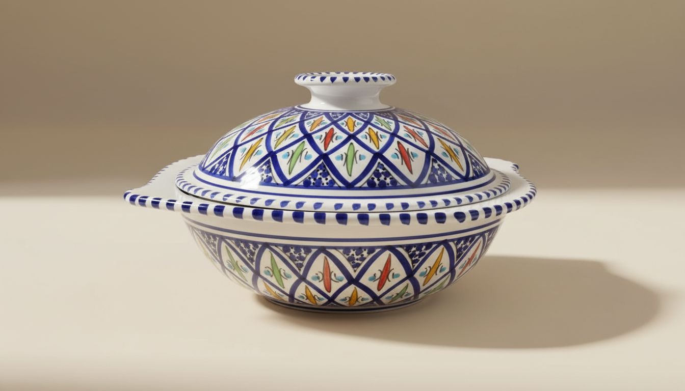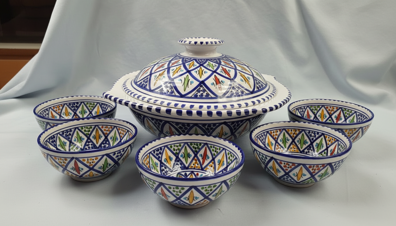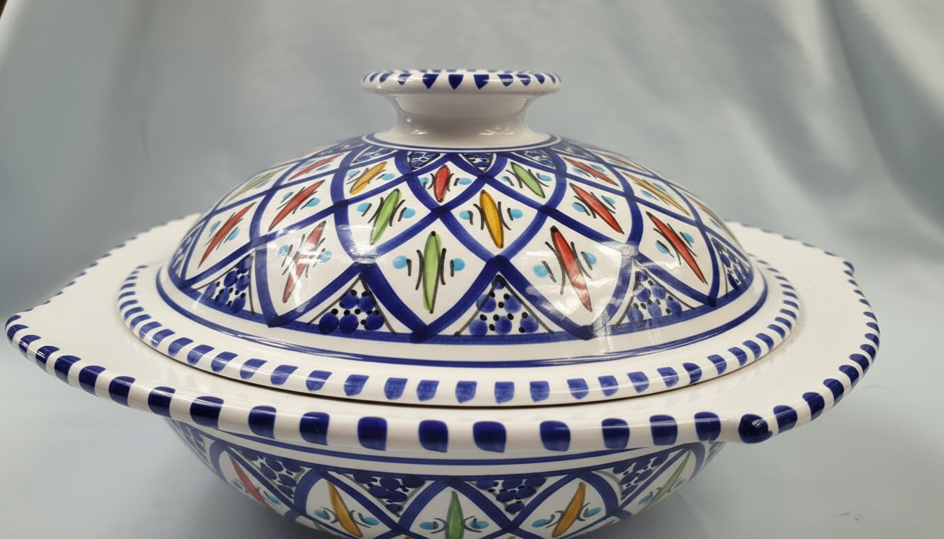 Designed with a lid to preserve heat and enhance presentation, it is perfect for serving soups, stews, or traditional Moroccan dishes like harira. Each bowl is handmade by skilled artisans, making every piece unique with slight variations that reflect its authenticity.